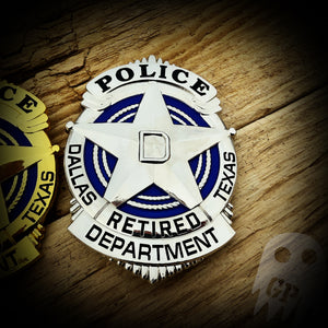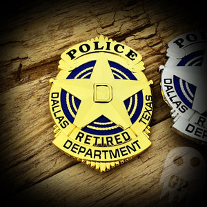 Dallas, Texas Police Department Retired Metal Badge. Available in both silver and gold.